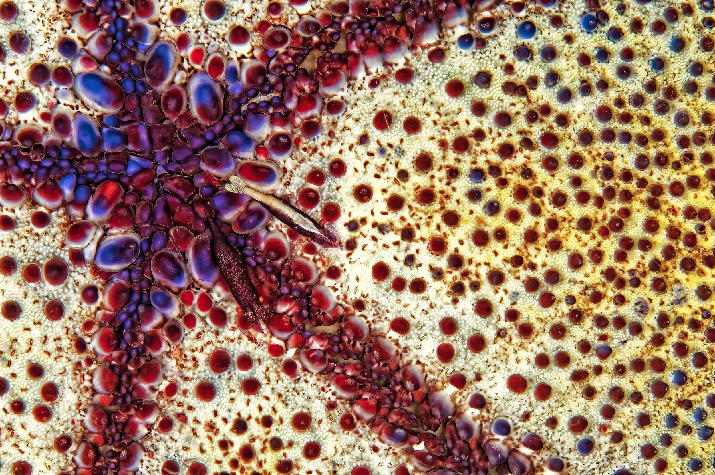 Imperial Shrimp on Sea Cucumber: A Symphony of Color and Texture - Seychelles